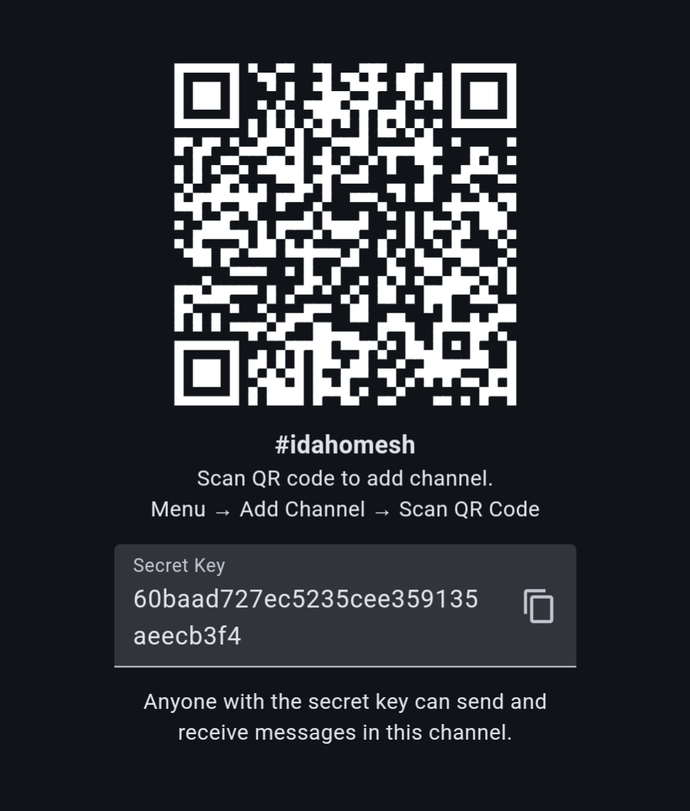 While most of us on the IdahoMesh monitor the public channel, our main channel is the #idahomesh you can join via the hashtag join button in your MeshCore app, or by scanning this QR code.